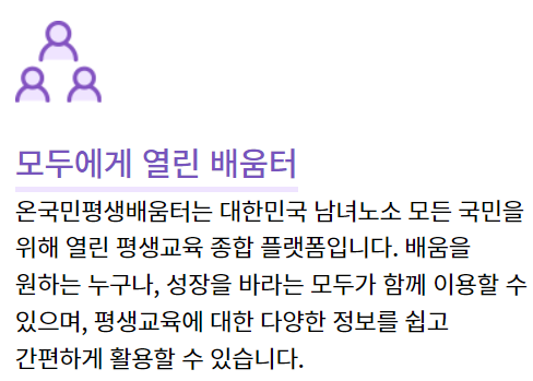 평생학습 통합(원스톱) 플랫폼 ‘온국민평생배움터(www.all.go.kr)’를 고도화해 인공지능(AI)·빅데이터 기반의 맞춤형 학습경로를 추천하는 등 학습자 중심의 평생학습 통합서비스를 제공합니다.
