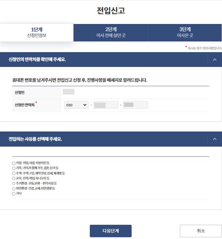 - 전입하는 사유를 선택 후, 다음단계 클릭합니다.