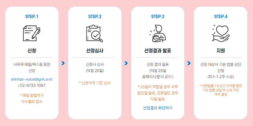 - 소송: 기본 상담 진행자 중 소송 지원 가능 대상 민사 소송 지원(변호사 비용과 소송 실비 등)