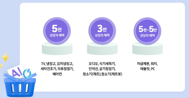 해당 품목 : TV, 2nd TV, 냉장고, 와인 냉장고, 냉동고, 변온냉장고, 정수기, 김치냉장고, 세탁건조기, 에어드레서, 슈드레서, 에어컨, 공기청정기, 제트 제트봇, 인덕션, 오븐, 식기세척기, 후드, 모니터, 오디오, MD(아카라)