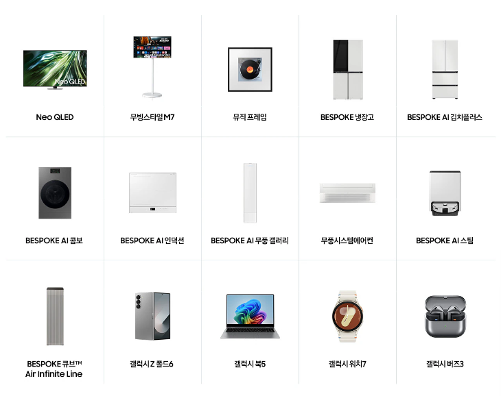 삼성전자는 총 15개 품목을 할인하고 누적구매 시 최대 559만 포인트 제공합니다.