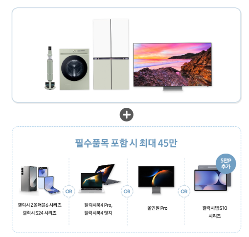 행사모델을 포함하여 삼성가전 구매 시 금액대별 최대 45만 원 상당 혜택이 있습니다.