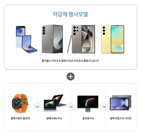 갤럭시 자급제폰 행사모델 & 갤럭시 북 or 갤럭시 워치 울트라 or 올인원 프로 동시구매 시 최대 10만 원 상당 혜택이 있습니다.