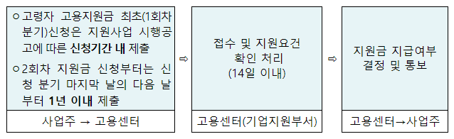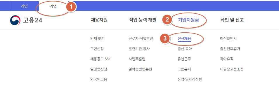 고용 24 접속→ 기업 → 기업지원금 → 신규채용 → 고령자 고용지원금