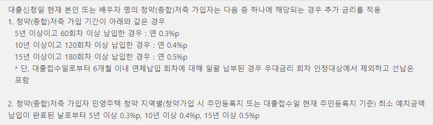 ① 청약(종합) 저축 가입자(본인 또는 배우자) 연 0.3% p~연 0.7% p 금리우대