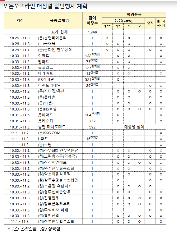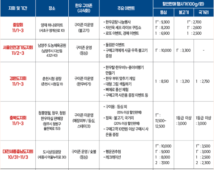 11월 8일까지 한우를 최대 50% 할인된 가격으로 구매할 수 있습니다. 11월 1일 한우 먹는 날을 맞이하여 전국의 대형마트, 농축협 하나로마트 등에서 대대적인 한우 할인행사를 진행합니다.